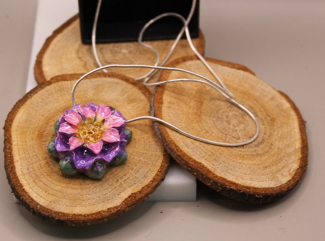 Kevyt, piristävä kukkakoru. Uniikisti maalattu ja koruhartsilla saatu kiilto.
